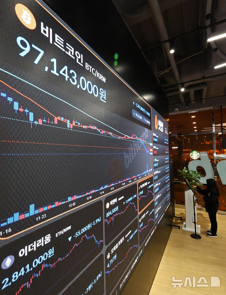 [서울=뉴시스] 최진석 기자 = 비트코인이 또다시 1억원선 아래로 후퇴한 뒤 지지부진한 흐름을 이어가고 있는 13일 서울 서초구 빗썸라운지 강남본점 전광판에 비트코인 시세가 보이고 있다. 비트코인의 달러 기준 시세는 6만6000달러대를 기록하고 있다. 2026.02.13. [email protected]