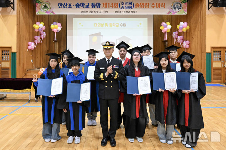 [서울=뉴시스] 이영환 기자 = 해군교육사령부 소속 한산도함 함장 진병석 중령이 13일 경남 통영시 한산초·중학교 체육관에서 열린 한산초·중학교 통합 제14회 졸업장 수여식에 참석해 학생들에게 장학금 증서를 수여한 후 기념촬영을 하고 있다. (사진=해군교육사령부 제공) 2026.02.13. [email protected] *재판매 및 DB 금지
