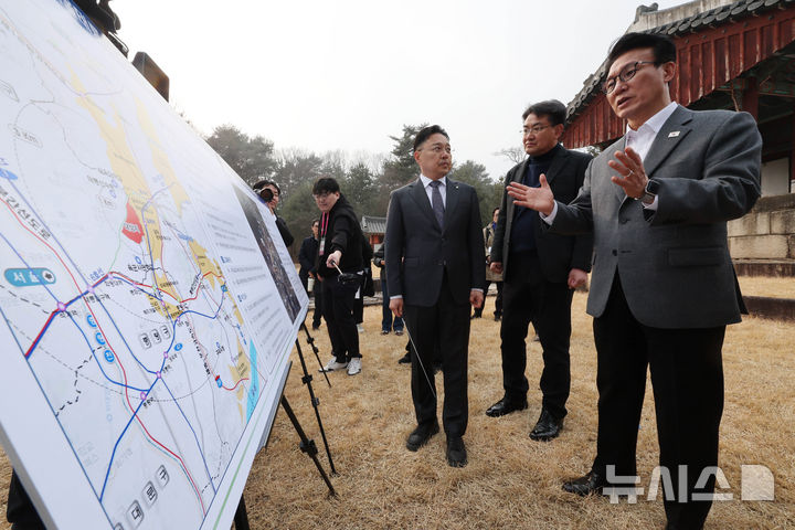 [서울=뉴시스] 배훈식 기자 = 1.29 도심주택공급방안 현장 점검에 나선 김민석 국무총리가 13일 오후 서울 노원구 강릉(명종, 인순왕후 능)에서 1.29 대책과 태릉 부지 현황에 대해 질문하고 있다. 2026.02.13. [email protected]