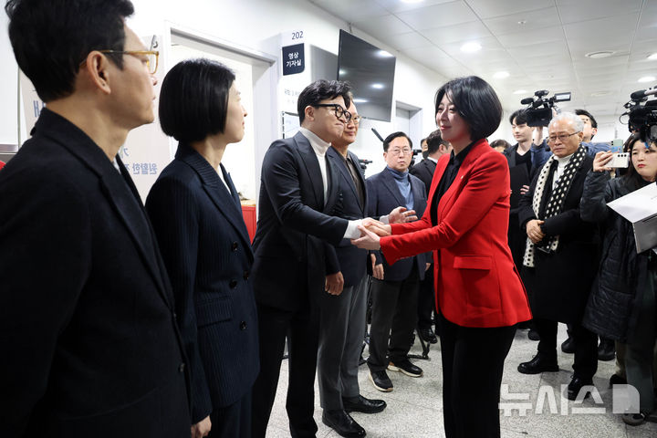 [서울=뉴시스] 조성봉 기자 = 배현진 국민의힘 의원이 13일 오후 서울 여의도 국회 소통관에서 기자회견을 열고, 자신에 대한 국힘 윤리위의 '당원권 정지 1년'에 대해 입장 발표를 하기 전 한동훈 전 대표와 친한계 의원들에게 격려를 받고 있다. 2026.02.13. [email protected]