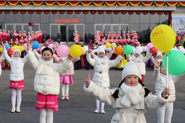 [평양=AP/뉴시스] 13일 북한 평양 동평양대극장에서 김정일 전 국방위원장의 생일(2월16일·광명성절) 84돌을 앞두고 제3차 2·16 경축 인민예술축전이 열려 어린이들이 공연을 펼치고 있다. 2026.02.14.