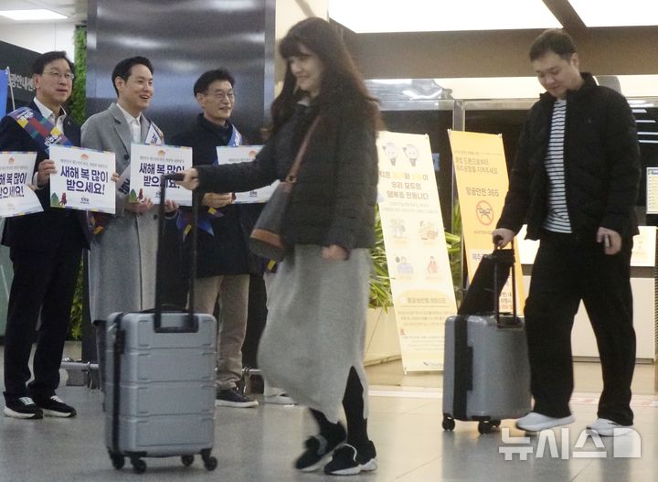 [제주=뉴시스] 양영전 기자 = 더불어민주당 위성곤(왼쪽부터)·김한규·문대림 국회의원이 설 연휴 첫날인 14일 오전 제주국제공항 1층에서 귀향객들에게 인사하고 있다. 2026.02.14. [email protected]