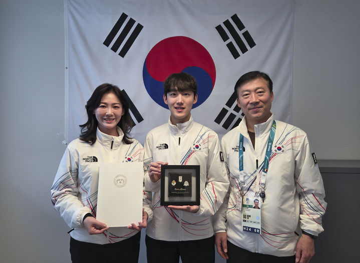 [밀라노=뉴시스] 김근수 기자 = 남자 쇼트트랙 임종언이 13일(현지 시간) 이탈리아 밀라노에서 이재명 대통령 축전을 받고 기념촬영을 하고 있다. 왼쪽부터 이수경 선수단장, 임 선수, 김택수 선수촌장 (사진 = 대한체육회 제공) 2026.02.14. [email protected] *재판매 및 DB 금지