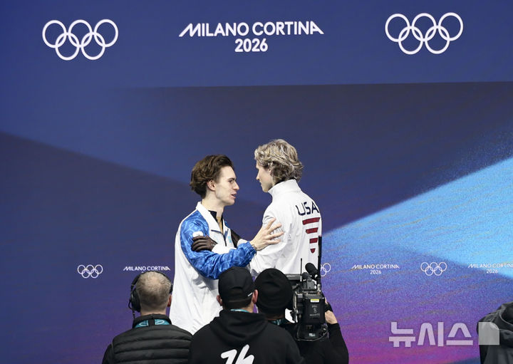 [밀라노=뉴시스] 김근수 기자 = 피겨스케이팅 금메달 미카일 샤이도로프(카자흐스탄)과 엘리아 말리닌이 13일(현지 시간) 이탈리아 밀라노 아이스 스케이팅 아레나에서 열린 2026 밀라노·코르티나 담페초 동계올림픽 피겨스케이팅 남자 싱글 프리스케이팅에서 연기를 마치고 이야기를 나누고 있다. 2026.02.14. [email protected]