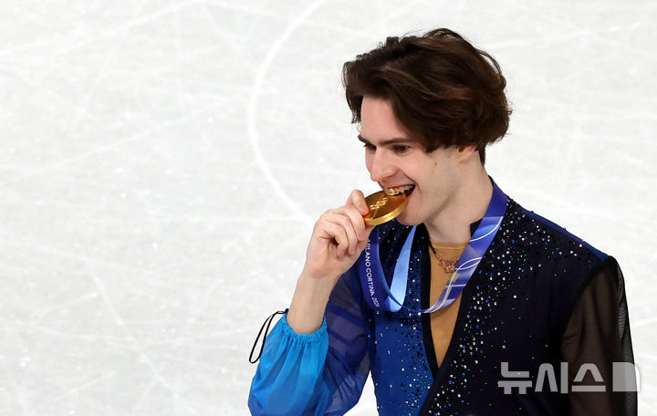 [밀라노=뉴시스] 박주성 기자 = 13일 (현지 시간) 이탈리아 밀라노 아이스 스케이팅 아레나 경기장에서 열린 2026 밀라노·코르티나담페초 동계올림픽 피겨스케이팅 남자 싱글 프리스케이팅에서 카자흐스탄 미카일 샤이도로프가 금메달을 딴 후 취재진에게 포즈를 취하고 있다. 2026.02.14. [email protected]