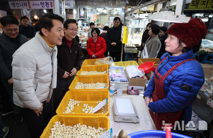 [서울=뉴시스] 권창회 기자 = 오세훈 서울시장이 14일 서울 영등포구 영등포 전통시장을 방문해 설 명절 물가점검 겸  상인들과 인사하고 있다. 2026.02.14. [email protected]