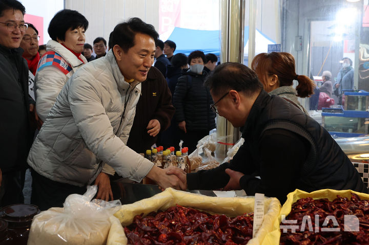 [서울=뉴시스] 권창회 기자 = 오세훈 서울시장이 14일 서울 영등포구 영등포 전통시장을 방문해 설 명절 물가점검 겸  상인들과 인사하고 있다. 2026.02.14. [email protected]