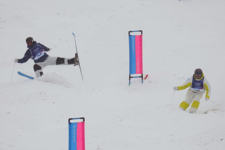 [리비뇨=AP/뉴시스] 윤신이(왼쪽)가 14일(현지 시간) 이탈리아 리비뇨 에어리얼 모굴 파크에서 열린 2026 밀라노·코르티나담페초 동계올림픽 여자 듀얼 모굴 32강에서 율리야 갈리셰바(카자흐스탄)와 경기하고 있다. 윤신이가 6-29로 패해 16강에 오르지 못했다. 2026.02.15.