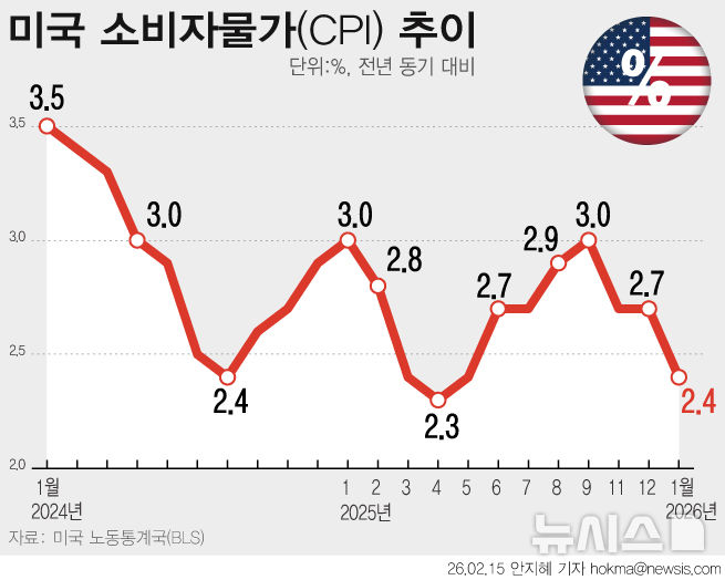 [서울=뉴시스] 지난달 미국의 소비자물가상승률이 예상치를 소폭 밑돌면서 8개월 만에 가장 낮은 수준을 기록했다. 미국 노동부는 14일(현지 시간) 1월 소비자물가지수(CPI)가 전년 동기 대비 2.4% 상승했다고 발표했다. (그래픽=안지혜 기자) [email protected]