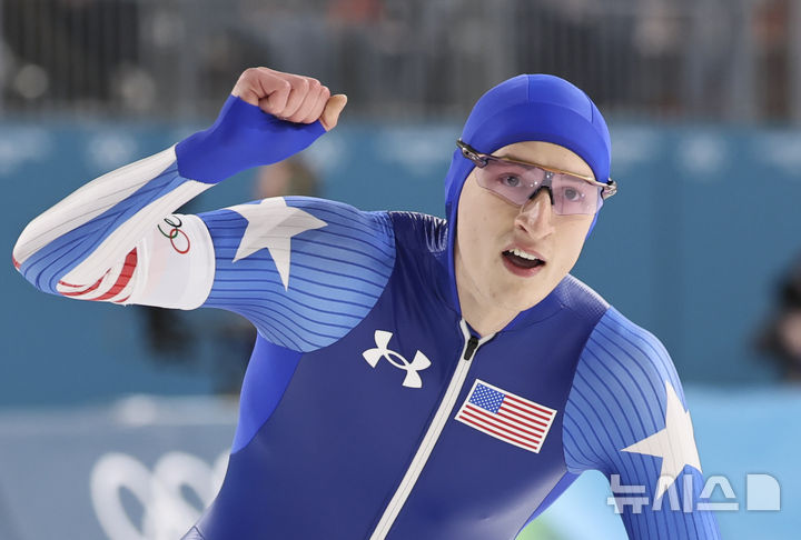 [밀라노=뉴시스] 김근수 기자 = 미국 조던 스톨츠(왼쪽)가 14일(현지 시간) 이탈리아 밀라노 스피드스케이팅 스타디움에서 열린 2026 밀라노·코르티나 담페초 동계올림픽 스피드 스케이팅 남자 500m에서 금메달을 차지한 뒤 경기장을 돌고 있다. 2026.02.15. [email protected]