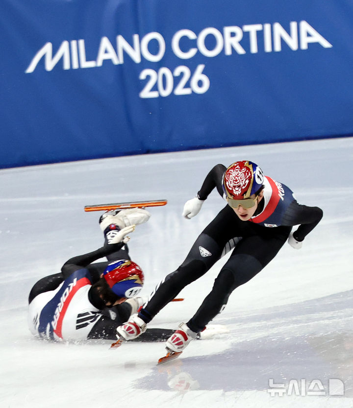 [밀라노=뉴시스] 박주성 기자 = 14일 (현지 시간) 이탈리아 밀라노 아이스 스케이팅 아레나 경기장에서 열린 2026 밀라노·코르티나담페초 동계올림픽 쇼트트랙 남자 1500m 준준준결승에서 신동민과 임종언이 출전, 임종언이 경기도중 넘어지고 있다. 2026.02.15. [email protected]