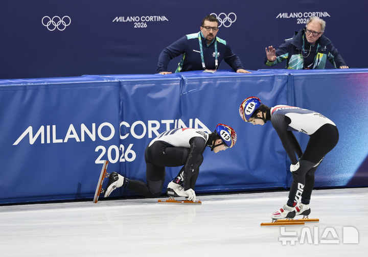 [밀라노=뉴시스] 김근수 기자 = 쇼트트랙 임종언(왼쪽)과 신동민이14일(현지 시간) 이탈리아 밀라노 아이스 스케이팅 아레나에서 열린 2026 밀라노·코르티나 담페초 동계올림픽 쇼트트랙 스피드스케이팅 남자 1500m 준준결승에서 미끄러 넘어져 아쉬워하고 있다. 2026.02.15. [email protected]