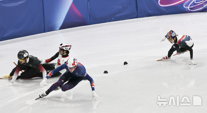 [밀라노=뉴시스] 김근수 기자 = 쇼트트랙 신동민이 14일(현지 시간) 이탈리아 밀라노 아이스 스케이팅 아레나에서 열린 2026 밀라노·코르티나 담페초 동계올림픽 쇼트트랙 스피드스케이팅 남자 1500m 준결승에서 2등으로 올라서고 있다. 2026.02.15. [email protected]