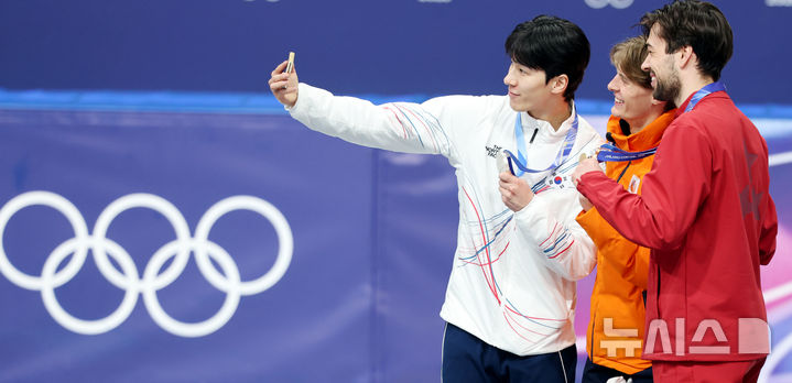 [밀라노=뉴시스] 박주성 기자 = 14일 (현지 시간) 이탈리아 밀라노 아이스 스케이팅 아레나 경기장에서 열린 2026 밀라노·코르티나담페초 동계올림픽 쇼트트랙 남자 1500m 결승에서 은메달을 획득한 황대헌이 금메달 네덜란드 옌스 판트 바우트(가운데)와 동메달 라트비아 로베르트 크루즈베르크스(오른쪽)와 셀카를 찍고 있다. 2026.02.15. [email protected]