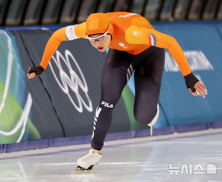 [밀라노=뉴시스] 박주성 기자 = 15일 (현지 시간) 이탈리아 밀라노 스피드스케이팅 스타디움에서 열린 2026 밀라노·코르티나 담페초 동계올림픽 스피드 스케이팅 여자 500m 경기에서 네덜란드 유타 레이르담이 역주하고 있다. 2026.02.16. [email protected]