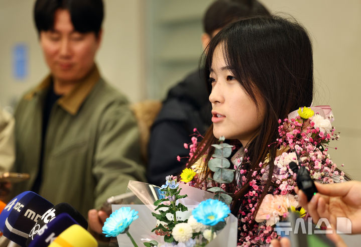 [인천공항=뉴시스] 최진석 기자 = 2026 밀라노·코르티나담페초 동계 올림픽 스노보드 여자 하프파이프 금메달을 획득한 최가온이 16일 인천국제공항 제2여객터미널을 통해 귀국해  인터뷰를 하고 있다. 최가온은 한국 설상 종목 1호 금메달리스트가 됐다. 이는 이번 대회에서 수확한 한국 선수단의 첫 금메달이다. 2026.02.16. [email protected]