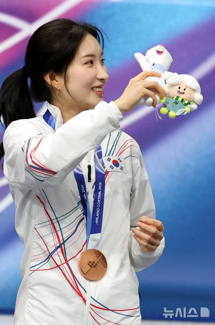 [밀라노=뉴시스] 박주성 기자 = 16일 (현지 시간) 이탈리아 밀라노 아이스 스케이팅 아레나 경기장에서 열린 2026 밀라노·코르티나담페초 동계올림픽 쇼트트랙 여자 1000m 결승에서 동메달을 획득한 김길리가 메달을 목에 걸고 기뻐하고 있다. 2026.02.16. [email protected]