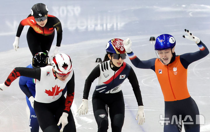 [밀라노=뉴시스] 박주성 기자 = 16일 (현지 시간) 이탈리아 밀라노 아이스 스케이팅 아레나 경기장에서 열린 2026 밀라노·코르티나담페초 동계올림픽 쇼트트랙 여자 1000m 결승에서 김길리가 3위로 들어와 동메달을 획득하고 있다. 금메달과 은메달은 네덜란드 잔드라 벨제부르와 캐나다 코트니 사로에게 돌아갔다. 2026.02.16. [email protected]