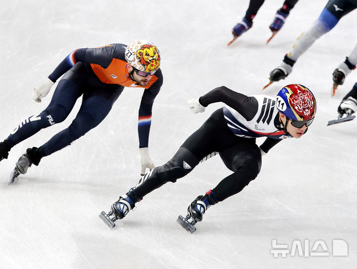 [밀라노=뉴시스] 박주성 기자 = 16일 (현지 시간) 이탈리아 밀라노 아이스 스케이팅 아레나 경기장에서 열린 2026 밀라노·코르티나담페초 동계올림픽 쇼트트랙 남자 5000m 계주 준결승에서 대한민국 대표팀 이정민이 역주하고 있다. 2026.02.16. [email protected]