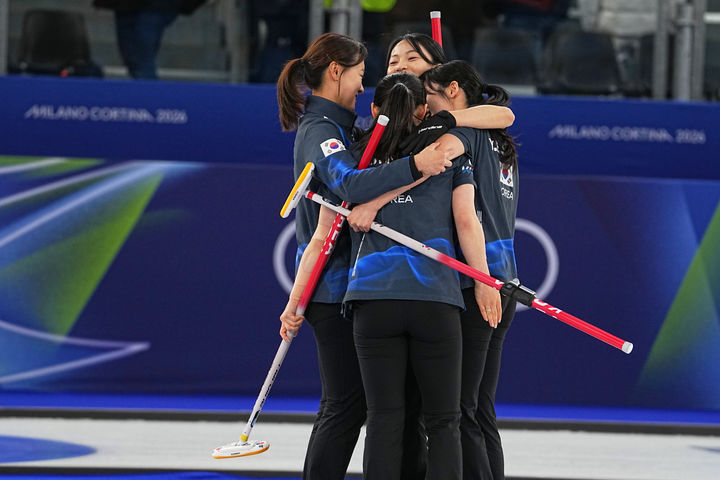 [코르티나담페초=AP/뉴시스] 한국 여자 컬링 대표팀이 16일(현지 시간) 이탈리아 코르티나담페초의 코르티나 컬링 올림픽 스타디움에서 열린 2026 밀라노·코르티나 동계올림픽 컬링 라운드로빈 6차전에서 중국을 물리친 뒤 자축하고 있다. 한국이 10-9로 재역전승을 거두고 4승2패를 기록했다. 2026.02.17.
