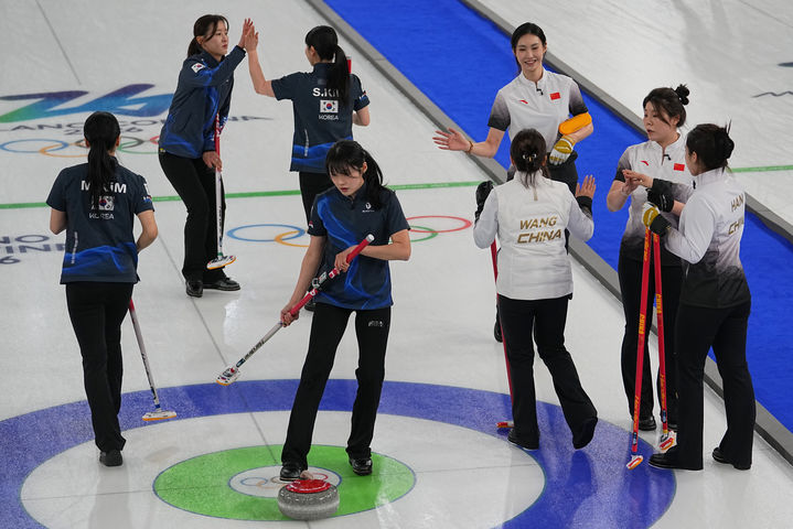 [코르티나담페초=AP/뉴시스] 한국 여자 컬링 대표팀(왼쪽)이 16일(현지 시간) 이탈리아 코르티나담페초의 코르티나 컬링 올림픽 스타디움에서 열린 2026 밀라노·코르티나 동계올림픽 컬링 라운드로빈 6차전 중국과 경기하고 있다. 한국이 10-9로 재역전승을 거두고 4승2패를 기록했다. 2026.02.17.
