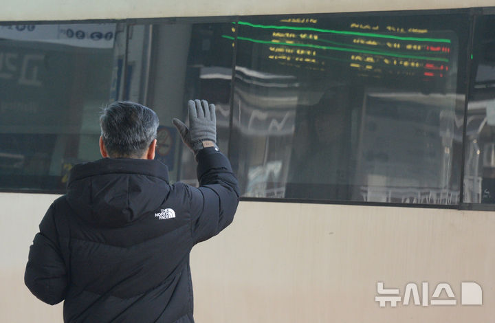 [전주=뉴시스] 김얼 기자 = 설 연휴 마지막날인 18일 전북 전주시 전주역 승강장에서 한 시민이 귀경열차에 손을 흔들며 인사를 하고 있다. 2026.02.18. [email protected]