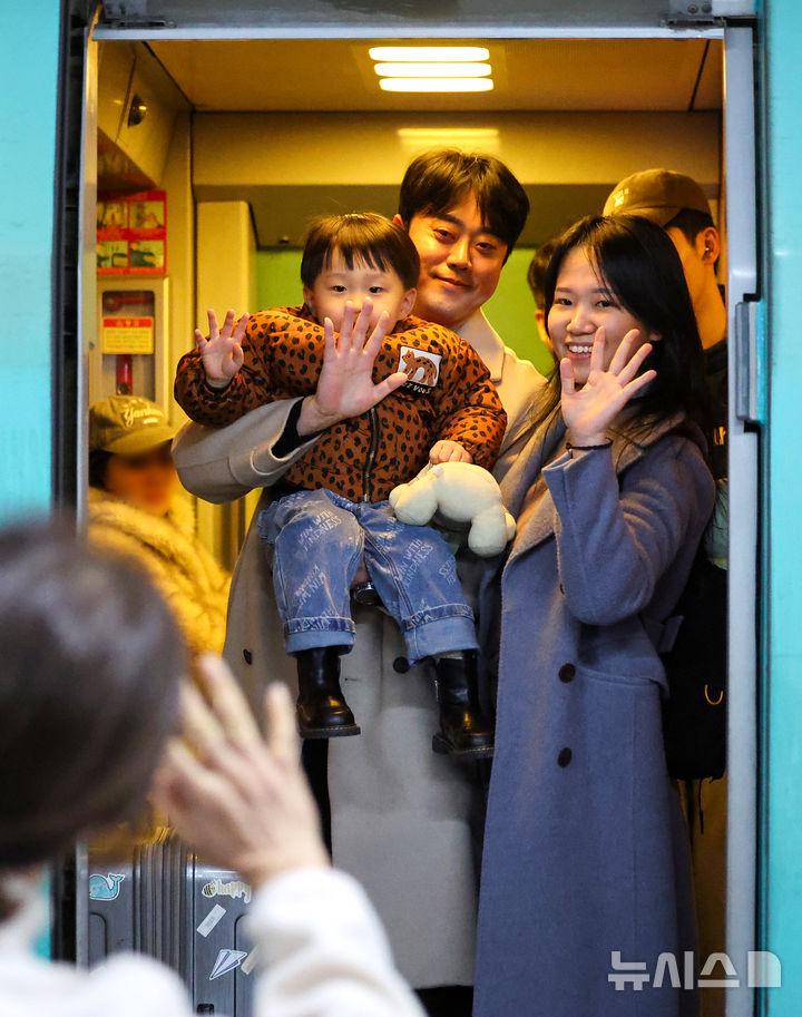 [대구=뉴시스] 이무열 기자 = 설 연휴 마지막 날인 18일 대구 동구 동대구역 승강장에서 할아버지와 할머니가 열차에 탑승한 손자에게 손을 흔들며 인사하고 있다. 2026.02.18. [email protected]