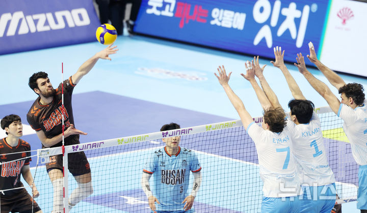 [인천=뉴시스] 김진아 기자 = 18일 오후 인천 계양체육관에서 열린 '진에어 2025-2026 V-리그' 대한항공과 OK저축은행의 경기, OK저축은행 디미트로프가 공격하고 있다. 2026.02.18. [email protected]