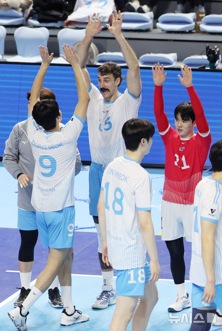 [인천=뉴시스] 김진아 기자 = 18일 오후 인천 계양체육관에서 열린 '진에어 2025-2026 V-리그' 대한항공과 OK저축은행의 경기, 세트 스코어 3-0(25-20 25-20 25-18)으로 승리한 대한항공 선수들이 기뻐하고 있다. 2026.02.18. [email protected]