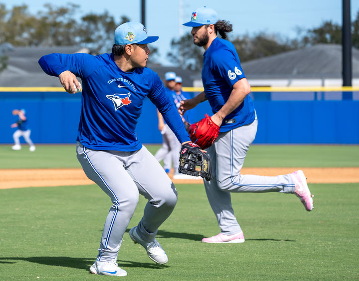 [더니든=AP/뉴시스] 토론토 블루제이스의 코디 폰세(오른쪽)가 18일(현지 시간) 미 플로리다주 더니든에서 열린 스프링 캠프에서 팀 훈련을 하고 있다. 2026.02.19.