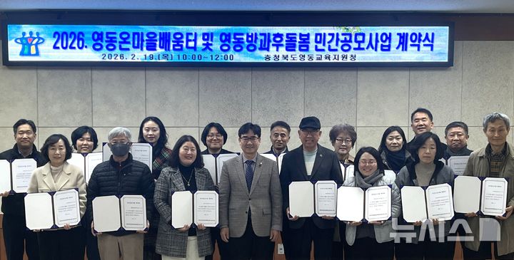 [영동=뉴시스] 충북 영동교육지원청이 19일 교육지원청 대회의실에서 '2026년 영동온마을배움터·영동방과후·돌봄 민간공모사업 계약식'을 열고 있다. 온마을배움터는 올해부터 마을방과후 분야와 마을돌봄 분야로 구분해 운영하고 방과후·돌봄은 세 가지 유형으로 추진한다. (사진=영동교육지원청 제공) 2026.02.19. [email protected]
