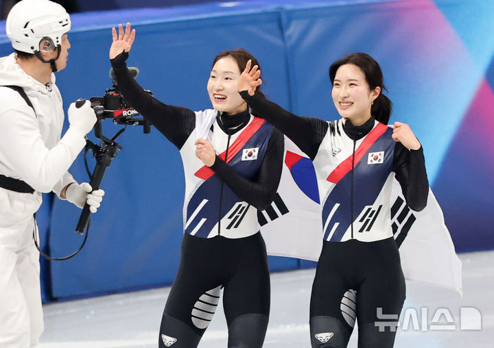 [밀라노=뉴시스] 박주성 기자 = 18일(현지 시간) 이탈리아 밀라노 아이스 스케이팅 아레나 경기장에서 열린 2026 밀라노·코르티나담페초 동계올림픽 쇼트트랙 여자 3000m 계주 결승에서 최민정과 김길리가 금메달을 획득하자 기뻐하고 있다. 2026.02.19. [email protected]