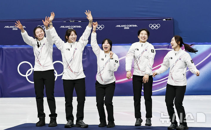 [밀라노=뉴시스] 김근수 기자 = 여자 쇼트트랙 대표팀이 18일(현지 시간) 이탈리아 밀라노 아이스스케이팅 아레나에서 열린 2026 밀라노·코르티나 담페초 동계올림픽 여자 쇼트트랙 3000m 계주 시상식에서 기뻐하고 있다. 2026.02.19. [email protected]