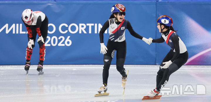 [밀라노=뉴시스] 박주성 기자 = 18일(현지 시간) 이탈리아 밀라노 아이스 스케이팅 아레나 경기장에서 열린 2026 밀라노·코르티나담페초 동계올림픽 쇼트트랙 여자 3000m 계주 결승에서 최민정과 김길리가 금메달을 획득하자 기뻐하고 있다. 2026.02.19. [email protected]
