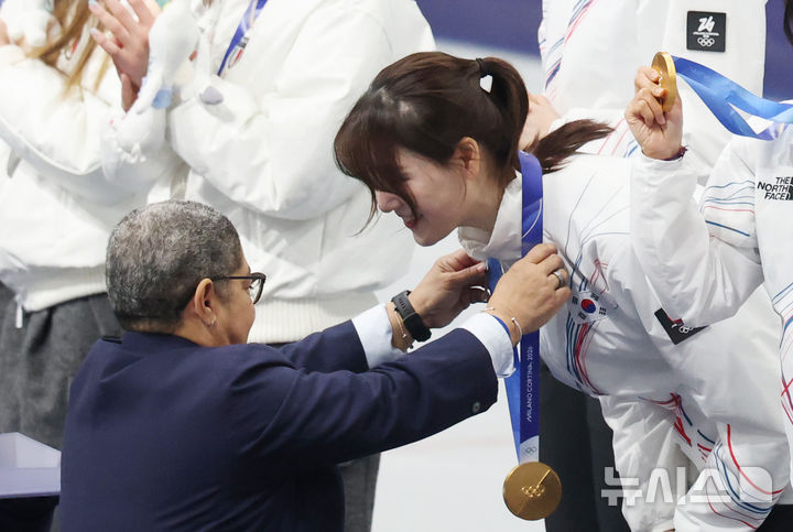[밀라노=뉴시스] 박주성 기자 = 18일(현지 시간) 이탈리아 밀라노 아이스 스케이팅 아레나 경기장에서 열린 2026 밀라노·코르티나담페초 동계올림픽 쇼트트랙 여자 3000m 계주 시상식에서 노도희가 금메달을 목에 걸고 있다. 2026.02.19. [email protected]