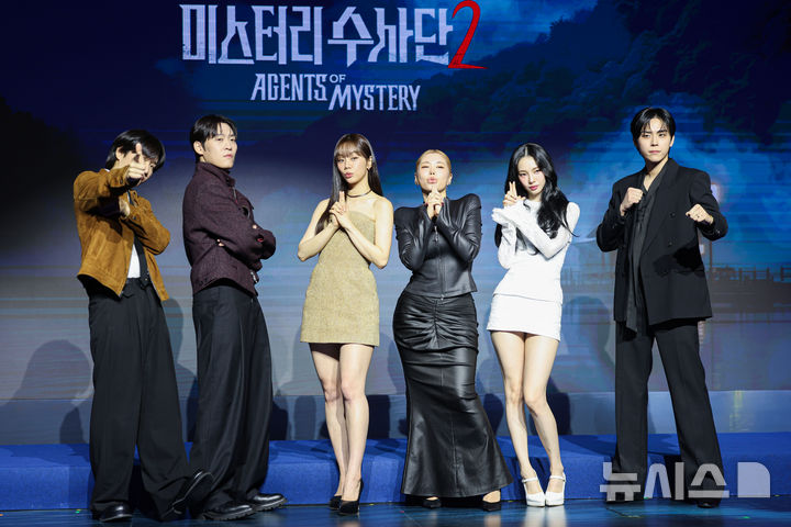 [서울=뉴시스] 권창회 기자 = 이용진(왼쪽부터), 존박, 혜리, 가비, 카리나, 김도훈이 19일 서울 마포구 호텔 나루에서 열린 넷플릭스 예능 '미스터리 수사단' 시즌2 제작발표회에서 포즈를 취하고 있다. 2026.02.19. [email protected]