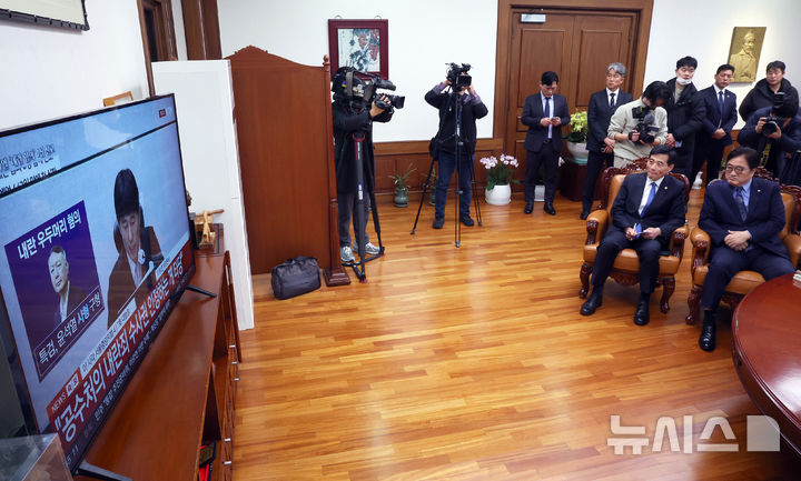 [서울=뉴시스] 고승민 기자 = 우원식 국회의장이 19일 서울 여의도 국회의장실에서 12·3 비상계엄 관련 내란 우두머리 혐의를 받는 윤석열 전 대통령의 1심 선고 공판 생중계를 시청하고 있다. (공동취재) 2026.02.19. [email protected]