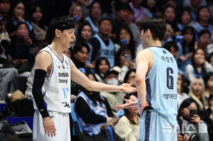 [고양=뉴시스] 김명년 기자 = 19일 경기 고양시 고양 소노아레나에서 열린 2025-2026 KBL 프로농구 고양 소노와 서울 삼성의 경기, 소노 이정현이 파울 콜 이후에 자신에게 공을 던진 삼성 이관희에게 항의하고 있다. 2026.02.19. [email protected]