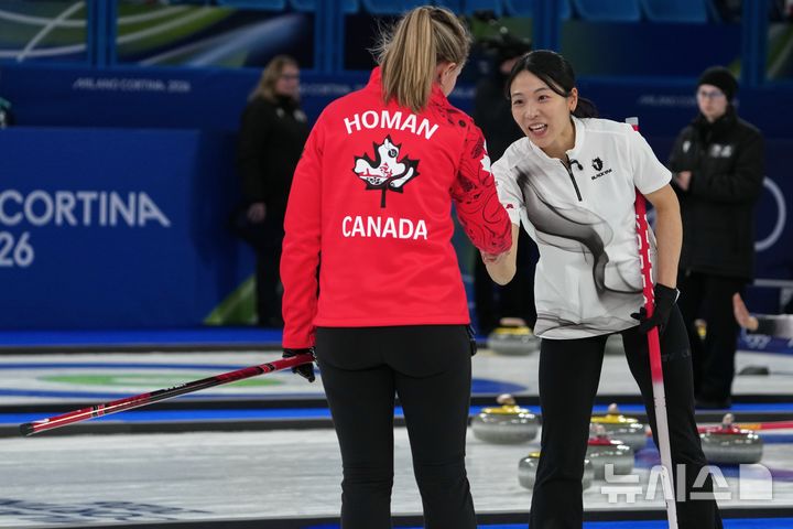 [코르티나담페초=AP/뉴시스] 한국 여자 컬링 대표팀 김민지가 19일(현지 시간) 이탈리아 코르티나담페초 컬링 올림픽 스타디움에서 열린 2026 밀라노·코르티나 동계올림픽 여자 컬링 라운드 로빈 9차전 캐나다와의 경기를 마친 뒤 캐나다 레이첼 호먼과 악수하고 있다. 2026.02.20.