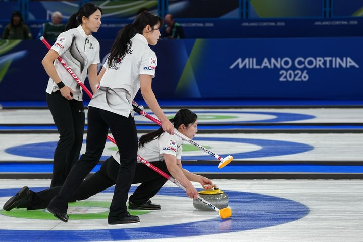 [코르티나담페초=AP/뉴시스] 한국 여자 컬링 대표팀 설예은이 19일(현지 시간) 이탈리아 코르티나담페초의 코르티나 컬링 올림픽 스타디움에서 열린 2026 밀라노·코르티나 동계올림픽 컬링 라운드로빈 9차전 캐나다와 경기 중 스톤을 투구하고 있다. 한국이 7-10으로 패해 5승4패, 5위를 기록하며 4강에 오르지 못했다. 2026.02.20.