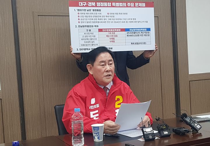 [대구=뉴시스] 정창오 기자=6·3 지방선거에서 경북도지사 출마를 선언한 최경환 전 경제부총리가 20일 오후 국민의힘 경북도당에서 가지회견을 열고 국회 의결을 앞둔 대구경북행정통합법을 비판하고 있다. 그는 이철우 경북지사를 겨냥해 "개인의 정치적 이익을 위해 통합을 악용한다는 의심을 지울 수 없다"고 비판했다. 2026.02.20 [email protected]