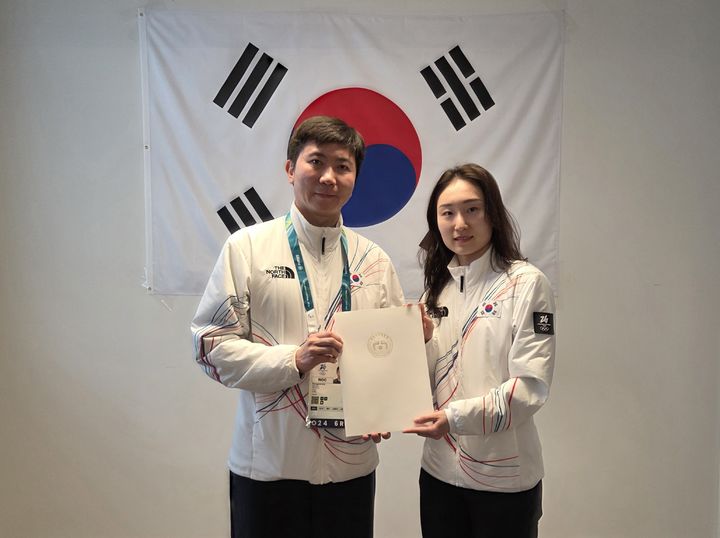 [밀라노=뉴시스] 박주성 기자 = 2026 밀라노·코르티나 담페초 동계올림픽 쇼트트랙 여자 3000m 계주에서 금메달을 차지한 최민정(오른쪽) 선수가 19일(현지 시간) 이탈리아 밀라노 선수촌 대한민국 선수단 사무실에서 이재명 대통령의 축전을 받은 뒤 유승민 대한체육회장과 기념촬영하고 있다. (시진=대한체육회 제공) 2026.02.20. [email protected]