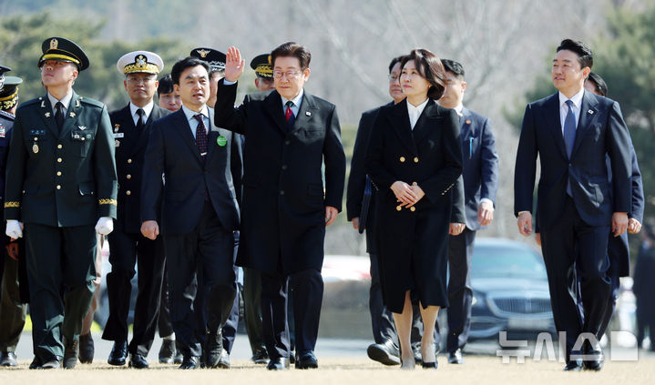 [계룡=뉴시스] 최동준 기자 = 이재명 대통령과 김혜경 여사가 20일 충남 계룡대 대연병장에서 열린 육·해·공군 사관학교 통합임관식에 입장하고 있다. (청와대통신사진기자단) 2026.02.20. [email protected]