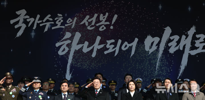 [계룡=뉴시스] 최동준 기자 = 이재명 대통령이 20일 충남 계룡대 대연병장에서 열린 육·해·공군 사관학교 통합임관식에서 거수경례를 하고 있다. (청와대통신사진기자단) 2026.02.20. [email protected]