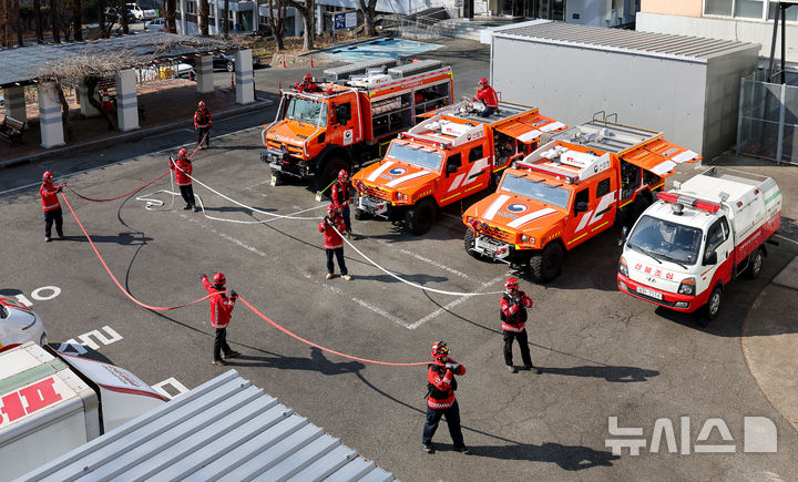 [대구=뉴시스] 이무열 기자 = 20일 대구 북구 대구시청 산격청사에서 남부지방산림청 구미국유림관리소 소속 산불재난 특수진화대원들이 장비 점검을 하고 있다.