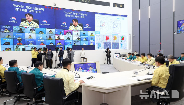 [세종=뉴시스] 강종민 기자 = 김광용 행정안전부 재난안전관리본부장이 20일 세종시 정부세종청사 중앙재난안전상황실에서 열린 봄철 산불 방지를 위한 관계 기관 대책회의에서 산불 방지 대책을 점검하고 있다. 2026.02.20. [email protected]