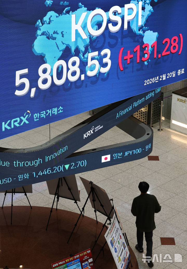[서울=뉴시스] 최진석 기자 = 코스피가 전 거래일(5677.25)보다 131.28포인트(2.31%) 오른 5808.53에 마감한 20일 서울 여의도 한국거래소 전광판에 코스피 종가가 보이고 있다.