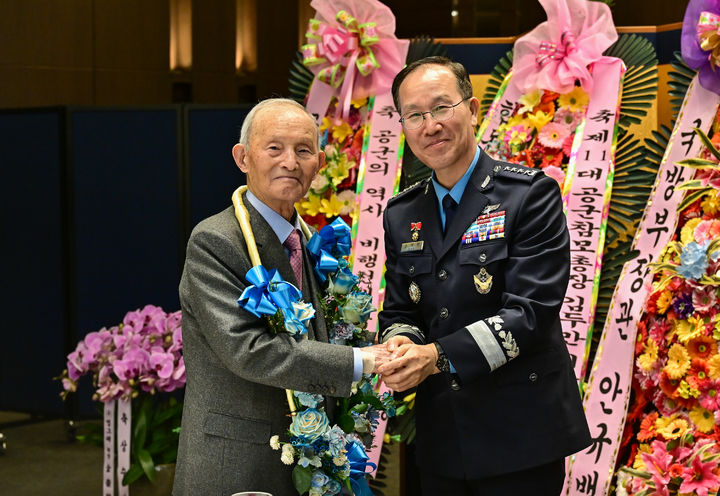 [서울=뉴시스] 정병혁 기자 = 20일 김두만, 한주석, 이광학 등 역대 공군참모총장 16명이 참석한 가운데 열린 공군 정책자문위원회 회의에서 손석락 공군참모총장과 역대 참모총장들이 김두만 전 참모총장의 백수를 축하하며 화환을 전달하고 있다. (사진=공군 제공) 2025.02.20. [email protected] *재판매 및 DB 금지