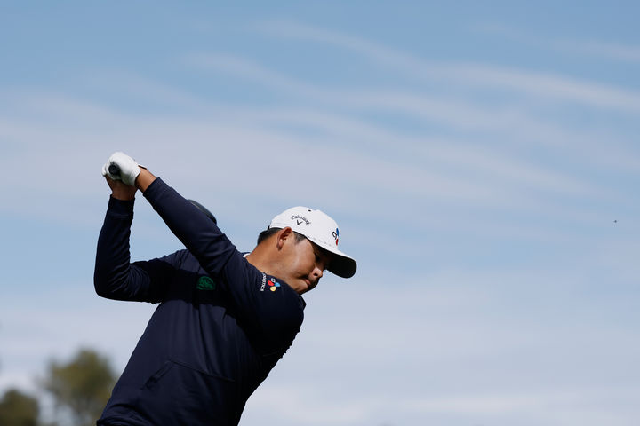 [로스앤젤레스=AP/뉴시스] 김시우가 20일(현지 시간) 미 캘리포니아주 로스앤젤레스 퍼시픽 팰리세이즈의 리비에라 컨트리클럽에서 열린 미국프로골프(PGA) 투어 제네시스 인비테이셔널 2라운드 9번 홀에서 티샷하고 있다. 김시우는 중간 합계 2언더파 140타 공동 25위를 기록했다. 2026.02.21.