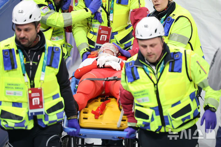 [밀라노=뉴시스] 박주성 기자 = 20일 (현지 시간) 이탈리아 밀라노 아이스 스케이팅 아레나 경기장에서 열린 2026 밀라노·코르티나담페초 동계올림픽 쇼트트랙 여자 1500m 준준결승에서 폴란드 카밀라 셀리에가 미국 크리스틴 산토스 그리즈월드, 이탈리아 아리아나 폰타나와 엉켜 넘어진 뒤 들것에 실려 나가고 있다.